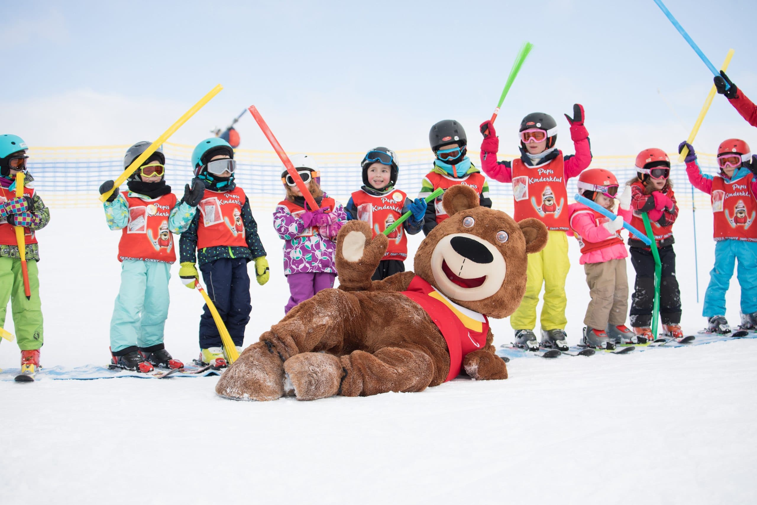 a group of children having fun with the ski school mascot